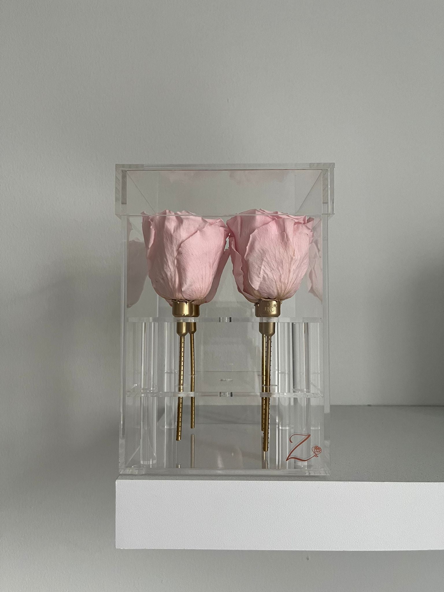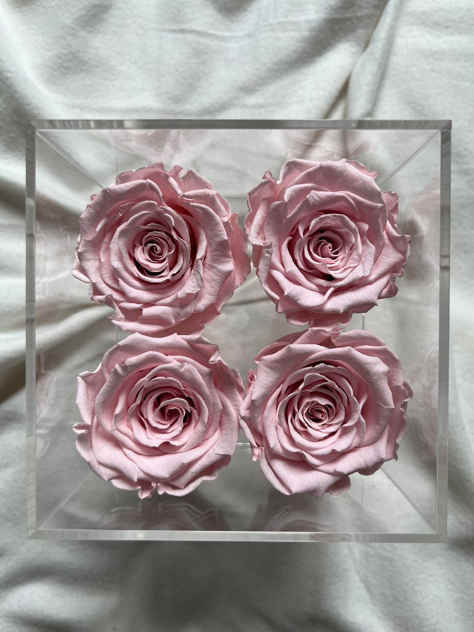 Elyanna is an elegant acrylic box housing four exquisite eternal roses, designed to retain their beauty and vibrancy for at least one year. With its refined and timeless design, this floral creation is perfect for enhancing your décor or offering a luxurious and meaningful gift.